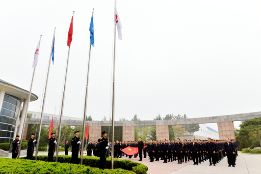 庆祝新中国70华诞活动拉开帷幕,参加活动的干部员工深情地凝望着缓缓升起的五星红旗集体行注目礼。