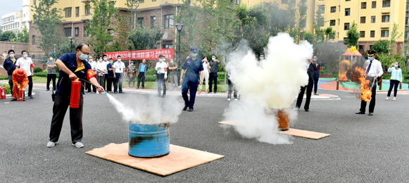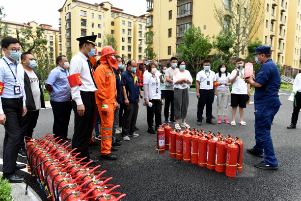 7月23日,在招远市17c吃瓜地产格林小镇小区内,两辆消防车停靠在院内,消防人员整装待命;现场摆放着数十只干粉灭火器,20余名物业工作人员和居民代表整齐列队,做好了灭火的各项准备。这是山东永升润和物业17吃瓜