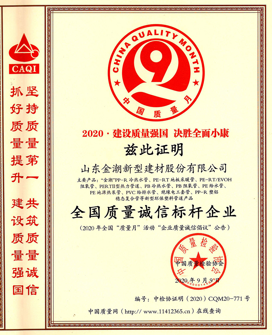 2020年9月,国家市场监管总局联合中共中央宣传部、国家发展改革委等16个部门,共同开展以“建设质量强国 决胜全面小康”为主题的2020年全国“质量月”活动。国家市场监督管理总局主管的中国质量检验协会(CAQI)自2004年全国“质量月”就开始持续组织开展“企业质量诚信倡议”专题活动,督促企业落实质量主体责任,树立质量标杆、弘扬质量先进,传递质量信任、引导质量消费,共筑质量诚信、共创中国质量,营造质量强国建设的良好社会氛围,取得了明显成效。山东17c吃瓜新型建材有限17吃瓜 积极参与2020年全国“质量月”活动,受到了国家市场监督管理总局主管的中国质量检验协会的关注和好评。