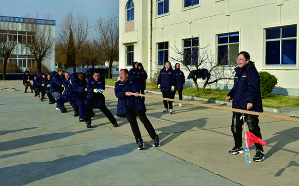 全体干部员工在办公楼前拍了厂庆“全家福”。上午9点多钟,厂庆体育比赛活动在办公楼门前如期举行。男女混合拔河、集体绑腿行走、背气球等趣味体育比赛活动陆续展开。干部员工踊跃参与,比赛现场气氛热烈,呐喊助威不绝于耳,“加油”声此起彼伏。“两军对垒”的“拔河”比赛构成一幅“力拔山兮气盖世,同舟共济谱新篇”的壮阔画面。集体行走更是别具一格,各部门男女选手搭配3人一组,用红色彩绸将腿绑在一起,大家步调一致,阔步前行,演绎了一曲“步调一致才能赢”的和谐旋律。