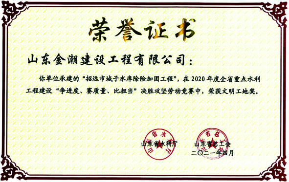 参建的“招远市城子水库除险加固工程”,荣获山东省水利厅和山东省总工会联合颁发的文明工地奖。